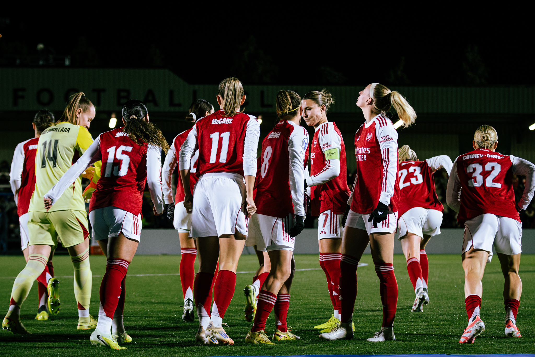 Welcome to this evening's live blog, the teams are just heading in from their warm ups but here's how Arsenal line up Anneke Borbe, Taylor Hinds, Lotte Wubben-Moy, Steph Catley, Katie McCabe, Kyra Cooney-Cross, Mariona Caldentey, Victoria Pelova, Beth Mead, Olivia Smith, Alessia Russo